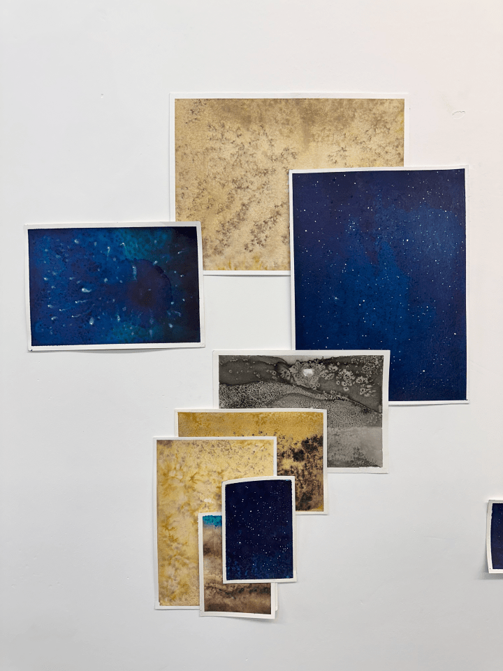 DE: The layering of the paintings, their overlapping and interactions, closely mirror the production process itself. These works, displayed under low light, are once again veiled within the dim exhibition space, both physically and conceptually. While some paintings possess a mature and dense surface, others take part in the exhibition with their uncertainties and cracks still intact. I often used ink as a kind of cover; yet some images seeped through from beneath it, forcing themselves into visibility. Some works stand on a threshold—neither fully repressed nor completely revealed. The weariness and fragility created by repeatedly applying ink become visible on the paper itself. With these physical effects, the display format also took shape organically: layered, overlapping, sometimes obscuring, sometimes exposing the surfaces.